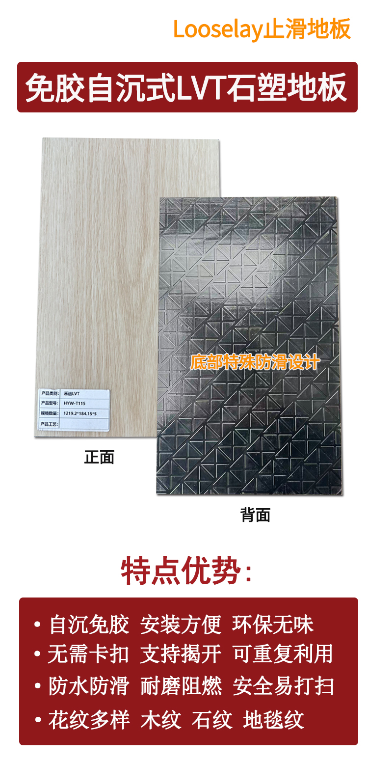 介绍:止滑地板又名自沉式LVT石塑地板,免胶、免卡扣安装,0甲醛、无异味、环保耐用,OA架空地板基层专用